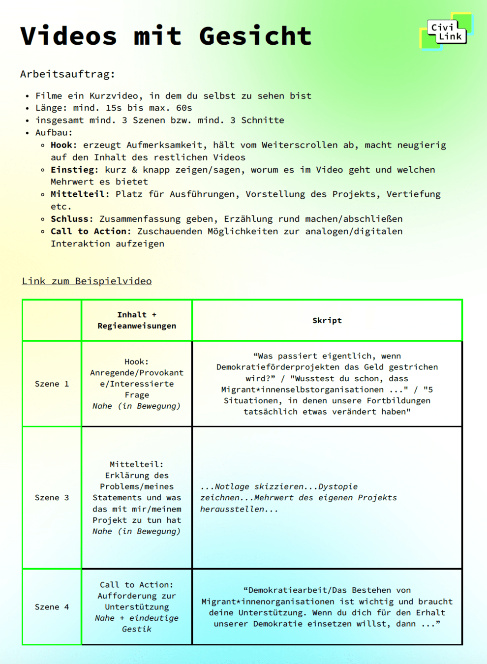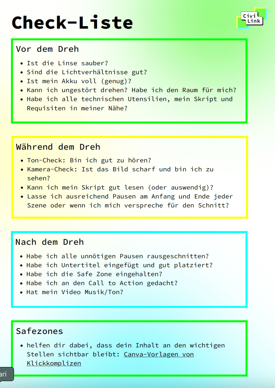 | Kann ich ungestört drehen? Habe ich den Raum für mich? | Lasse ich ausreichend Pausen am Anfang und Ende jeder Szene oder wenn ich mich verspreche für den Schnitt? | Habe ich an den Call to Action gedacht? |