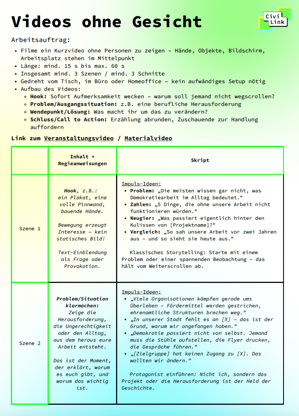 Arbeitsauftrag und nützliche Tools (neben Canva Video Editor) gibt es als PDF